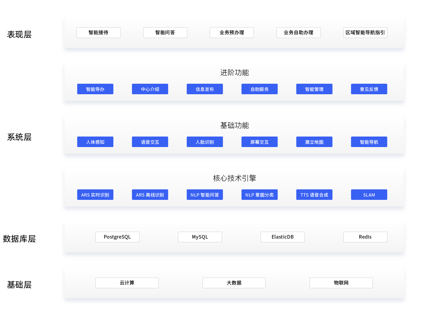 智能服务机器人应用管理平台可建立中心业务知识图谱,可含盖税务、不动产、人社、司法、水务、体育、统计业务等等。并将云端资料库置入到机器人内部,为办事群众解答各种中心业务常见问题。
