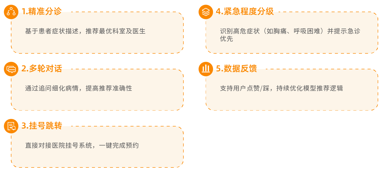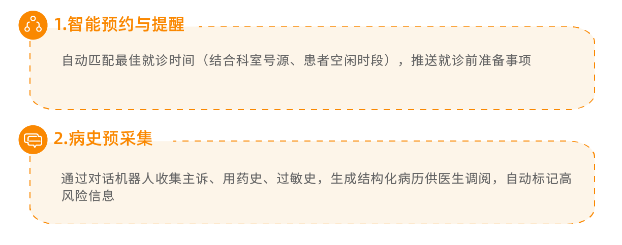 AI 通过症状分析推荐最优科室,AI预问诊分流,缩短医生面诊时间,AR 实景指引+实时排队提醒,减少无效走动