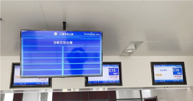 星际互动为江夏市民之家设计了完整的智慧政务系统方案,在中心办事大厅量身打造安装了数台壁挂式一体机数字显示终端,另在中心其他重要位置部署多台自助行政机,排队取号机,信息查询机。
